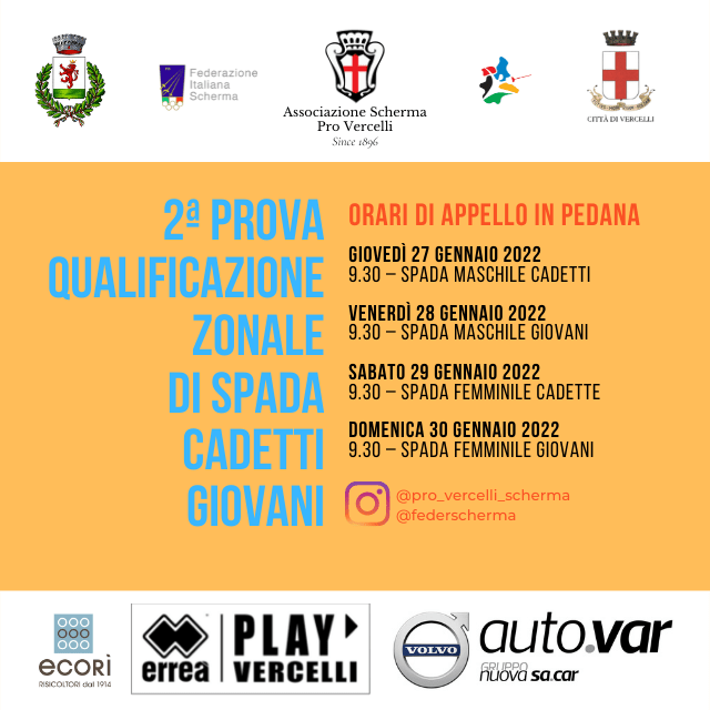 L’Associazione Scherma Pro Vercelli e VercelliFiere ospiteranno la seconda prova di qualificazione di spada riservata ai cadetti e ai giovani della zona 1. Dal 26 gennaio centinaia di partecipanti con relativi accompagnatori raggiungeranno Vercelli per questa importante gara di qualificazione alla fase nazionale.